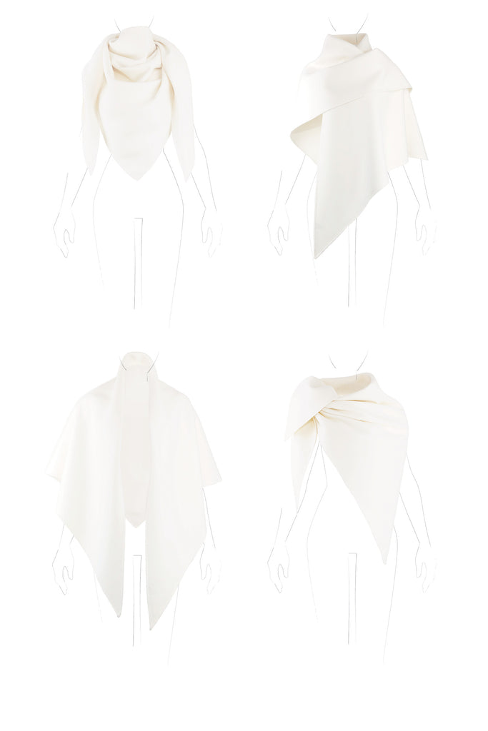 Rendered in a natural melange, this oversized triangle wrap was designed for playful sculpting, adding warmth and whimsy to a winter wardrobe. A removable leather pin allows versatile styling.